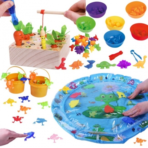 Zestaw Mała Motoryka Żabki rozwija zręczność, koncentrację i koordynację dziecka poprzez zabawę. Zawiera matę sensoryczną, skaczące żabki, dinozaury z pęsetkami oraz drewniane robaczki i marchewki do sortowania – idealny do terapii ręki i przedszkola.